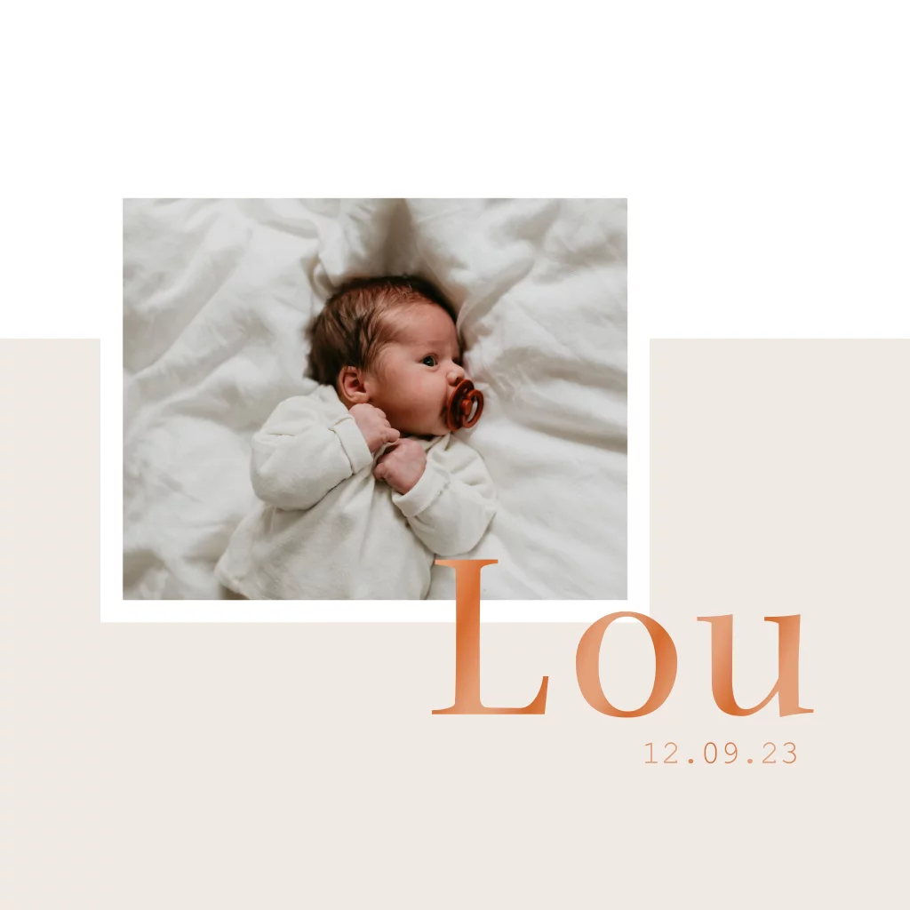 Dit geboortekaartje is unisex dus kan voor zowel een meisje als een jongen. De aardetint kleuren van dit kaartje kun je zelf aanpassen naar wens net als de koperkleurige lakfolie dat je aan kunt passen naar andere UV spotlak of foliedruk kleuren.