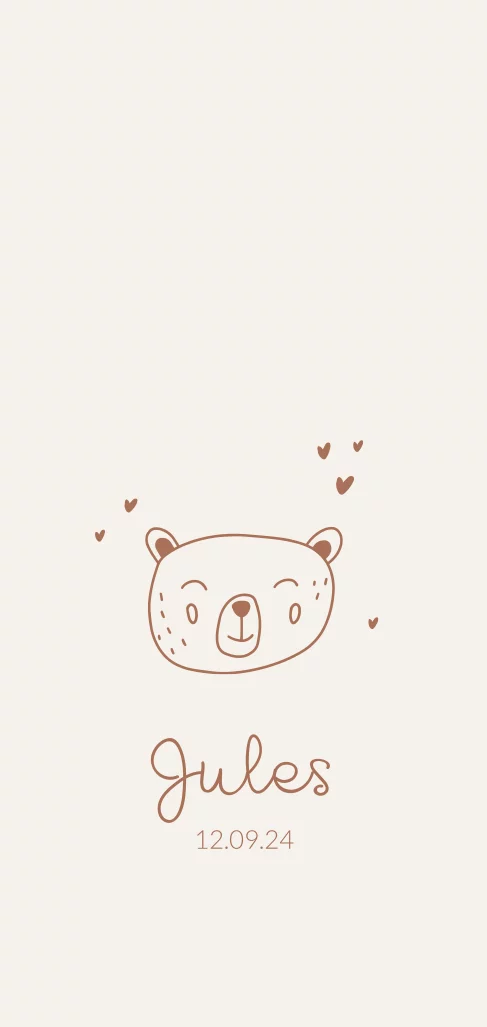 Een lief geboortekaartje voor een jongen of meisje met lijntekening van een beren hoofdje. De hartjes, de tekening en de tekst kun je omzetten in een andere kleur.