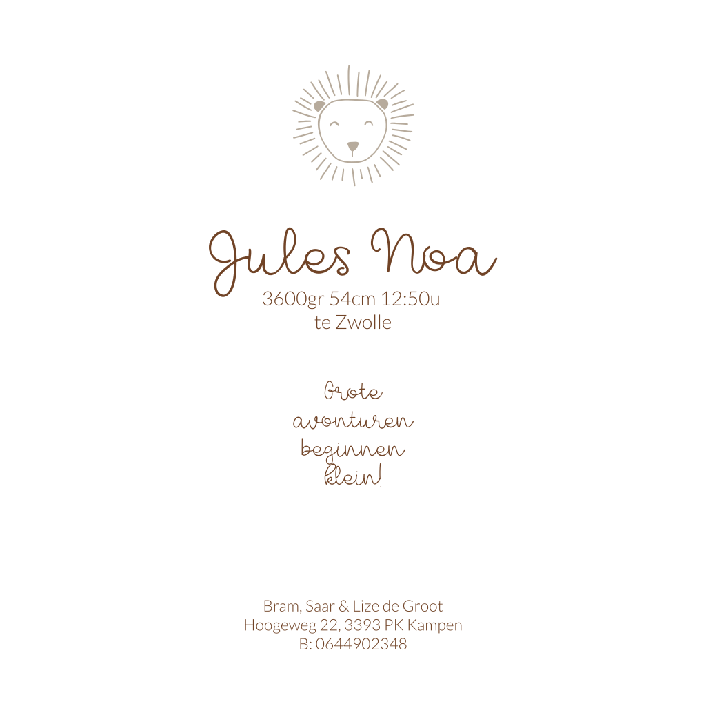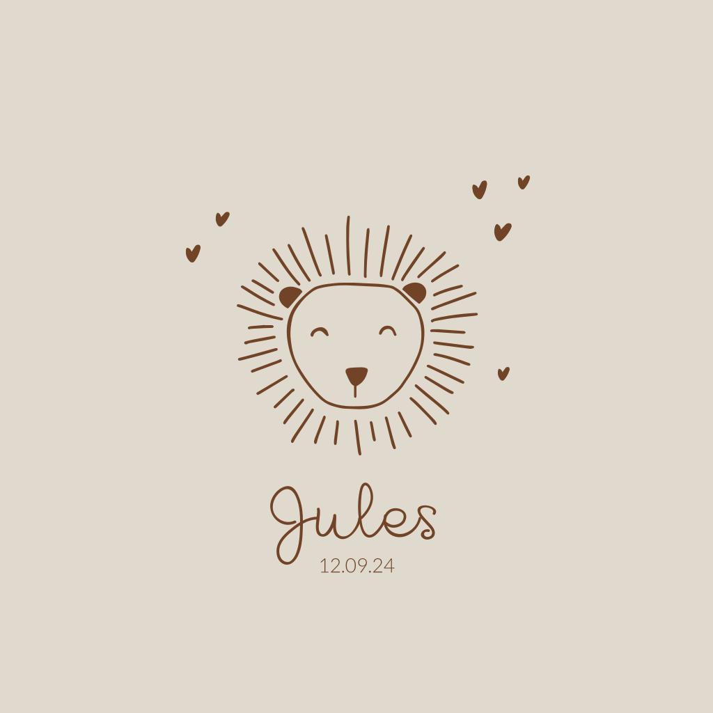 Dit lieve geboortekaartje is unisex dus geschikt voor een jongen of een meisje. Met een lijntekening van een leeuwenhoofd van een leeuwen welpje met hartjes kun je zelf aanpassen naar wens en smaak. De bruine en beige kleuren en het lettertype.