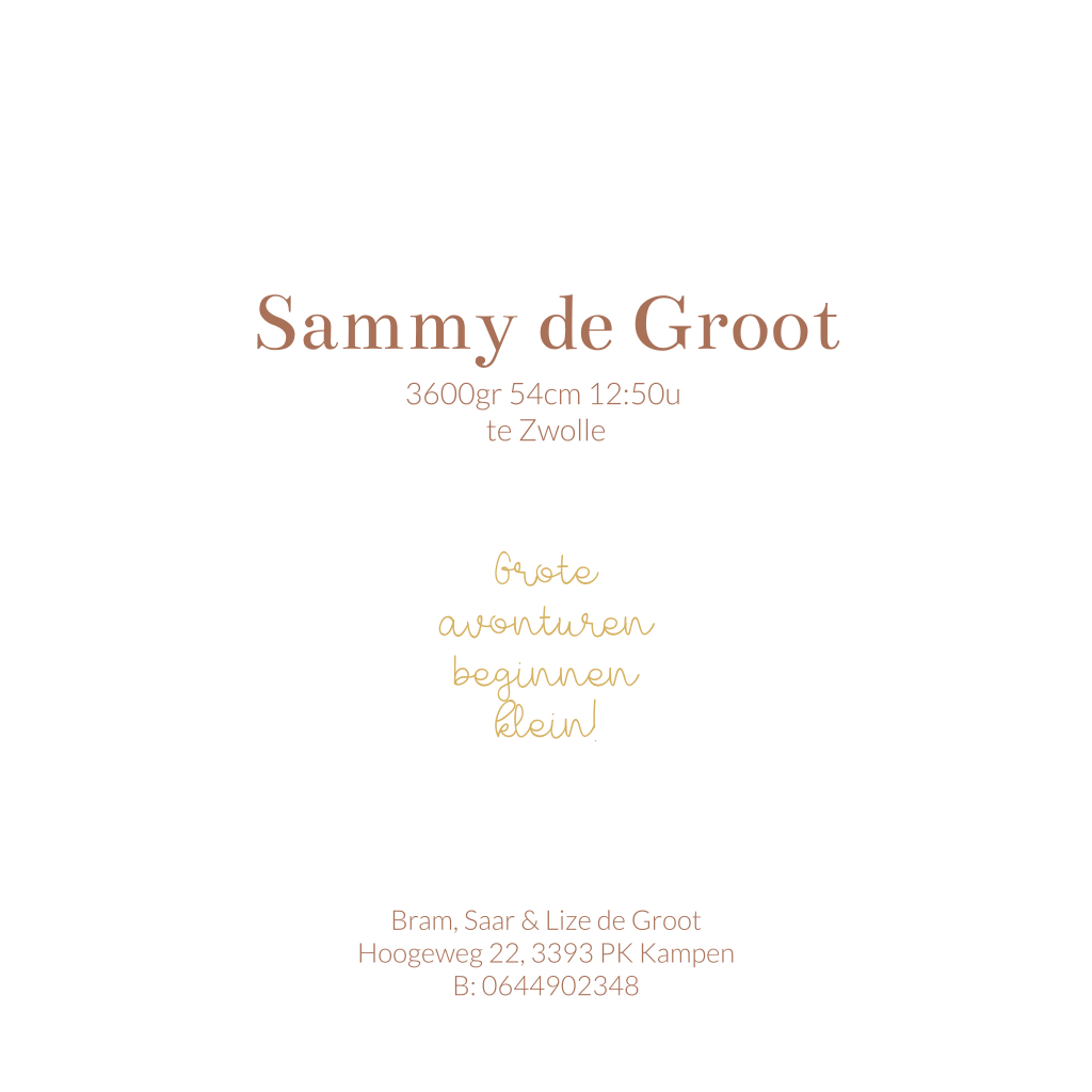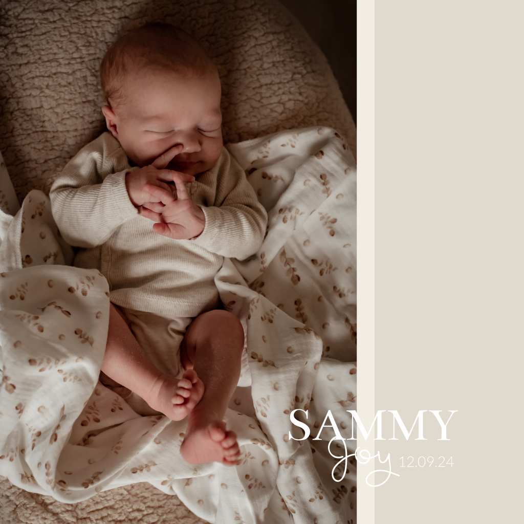 Je kunt de beige kleuren en de foliedruk kleur aanpassen naar wens. Natuurlijk met een mooie foto van jullie eigen newborn erop :)