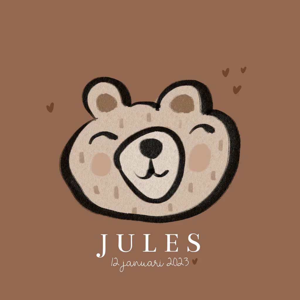 Een stoer artistiek geboortekaartje voor een jongen of meisje met een tekening van een beren hoofd met dikke lijnen. Jules