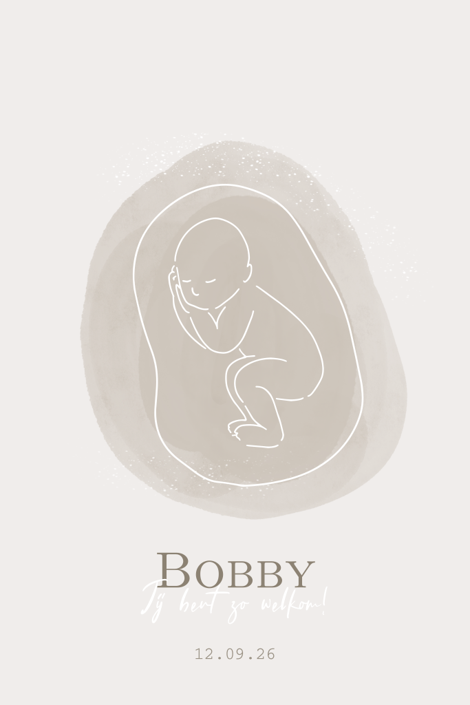 Geboortekaartje voor een meisje of jongen met een lijntekening van een baby in de baarmoeder.