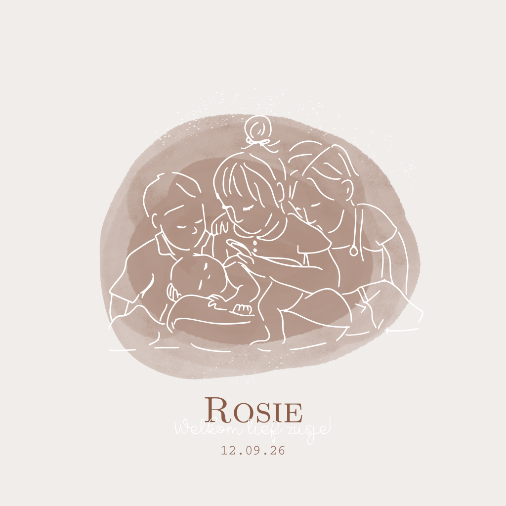 Dit geboortekaartje met lijntekening van een zus en twee broertjes met hun baby broertje of zusje kan voor zowel een jongen als een meisje. De kleuren van het kaartje kun je ook nog aanpassen naar wens en smaak. Ook de foliedruk kleur kun je zelf aanpassen.