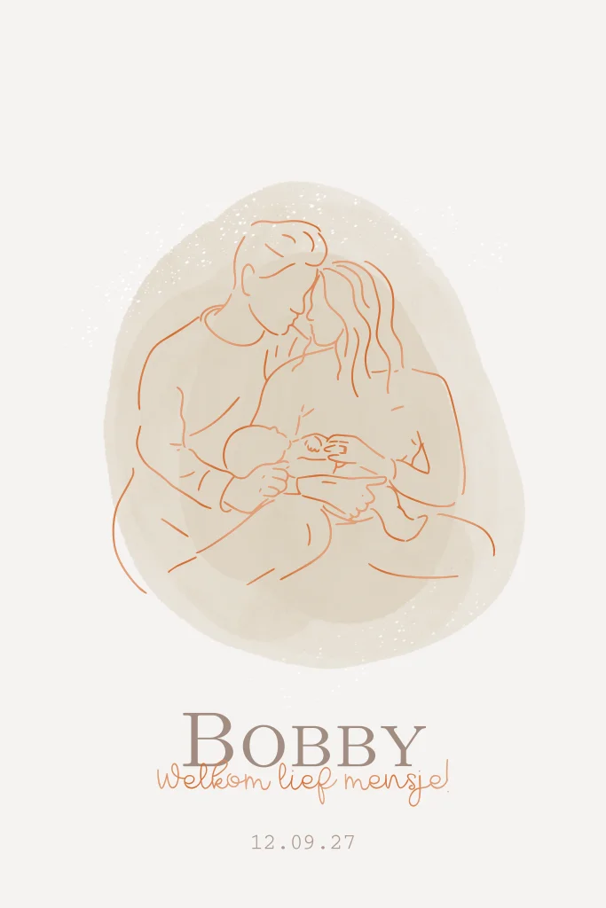 Dit bohemian geboortekaartje voor een jongen of meisje met een lijntekening van de ouders met hun kindje kun je zelf maken zoals je wilt.