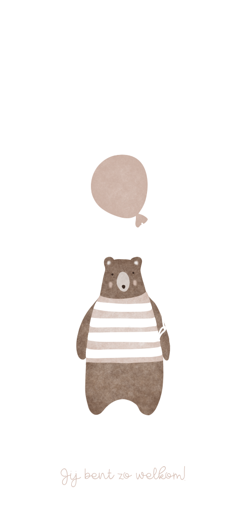 Een langwerpig staand geboortekaartje voor een meisje met een illustratie van een beer met ballon in roze tinten.
