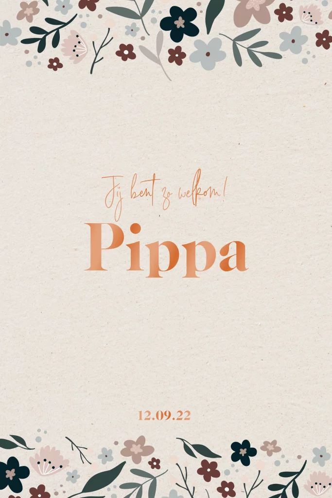 Dit geboortekaartje voor een meisje met bloemen in mooie pastelkleurige tinten en koper kleurige UV spotlak kun je zelf nog aanpassen naar wens en smaak. Zo maak je een unieke kaart voor jullie dochter.