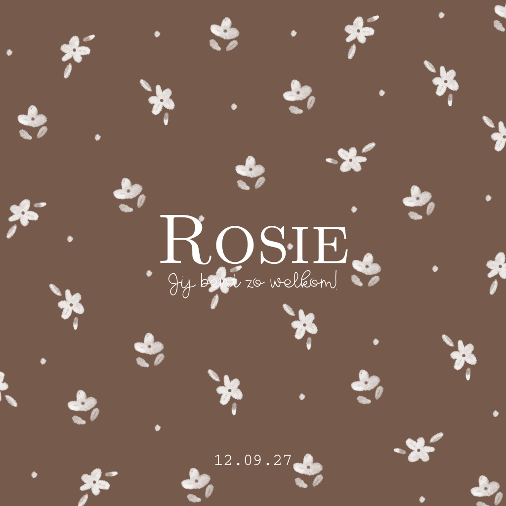 Dit lieve geboortekaartje voor een meisje met bruine achtergrond en witte kleine bloemenprint kun je zelf aanpassen naar wens.