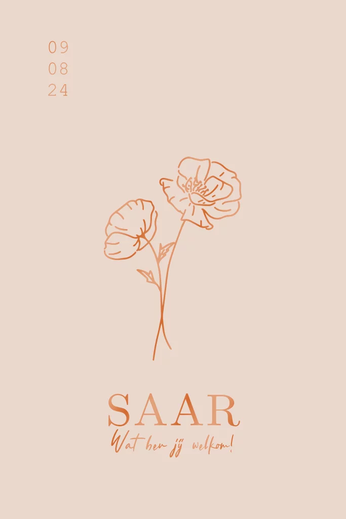 Geboortekaartje meisje geboortebloem augustus klaproos roze koperfolie