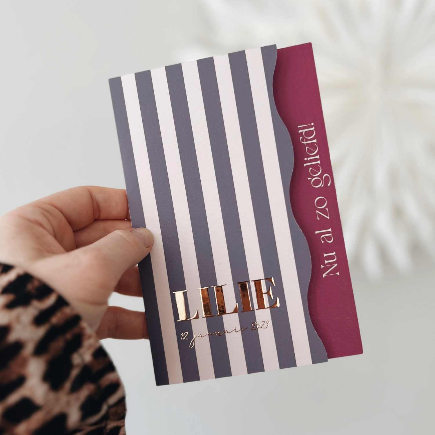 Een tof geboortekaartje met golvende rand en paarse strepen en naam in roséfolie. Zelf helemaal aan te passen. Lillie