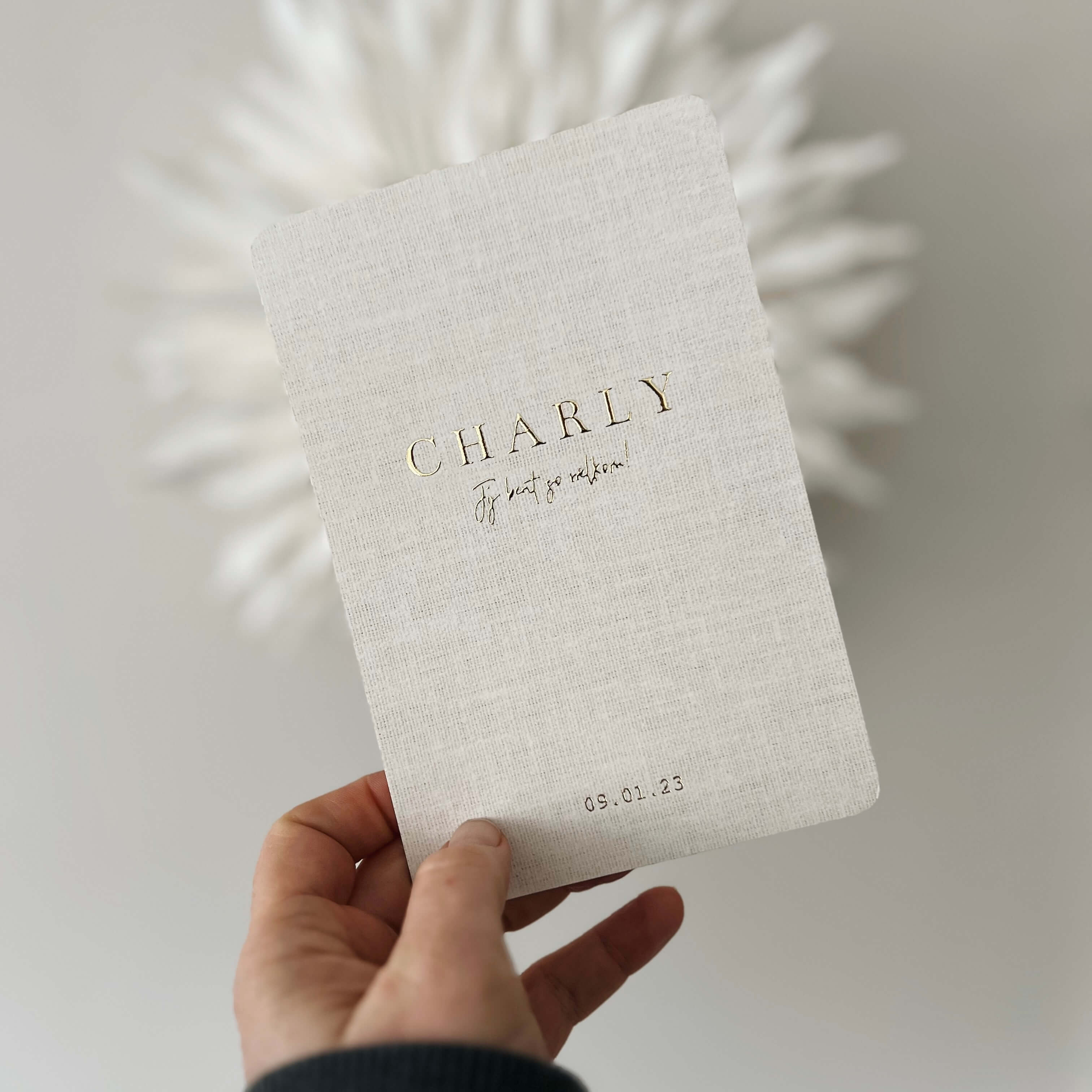Geboortekaartje meisje jongen met linnen papier look goudfolie en lint