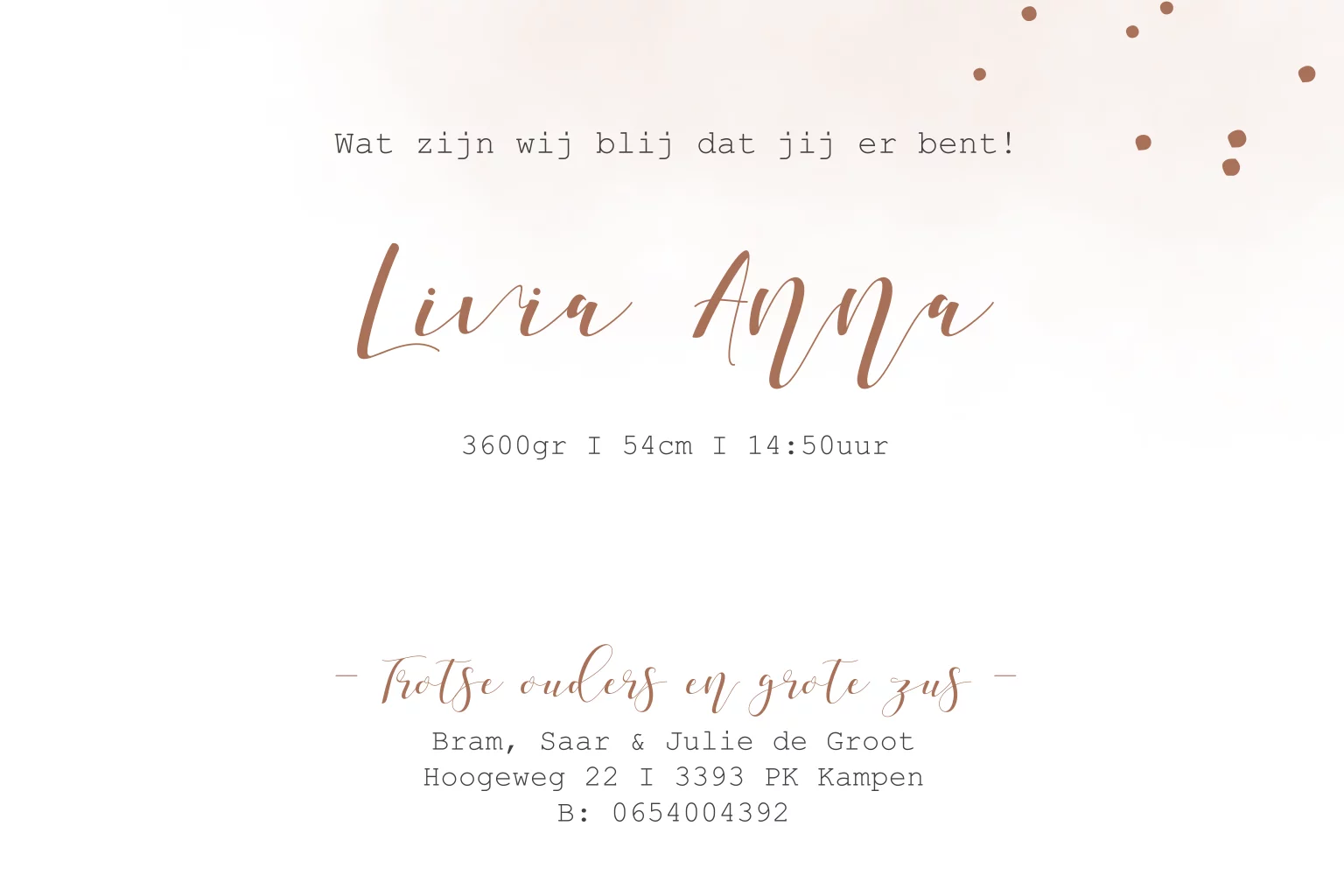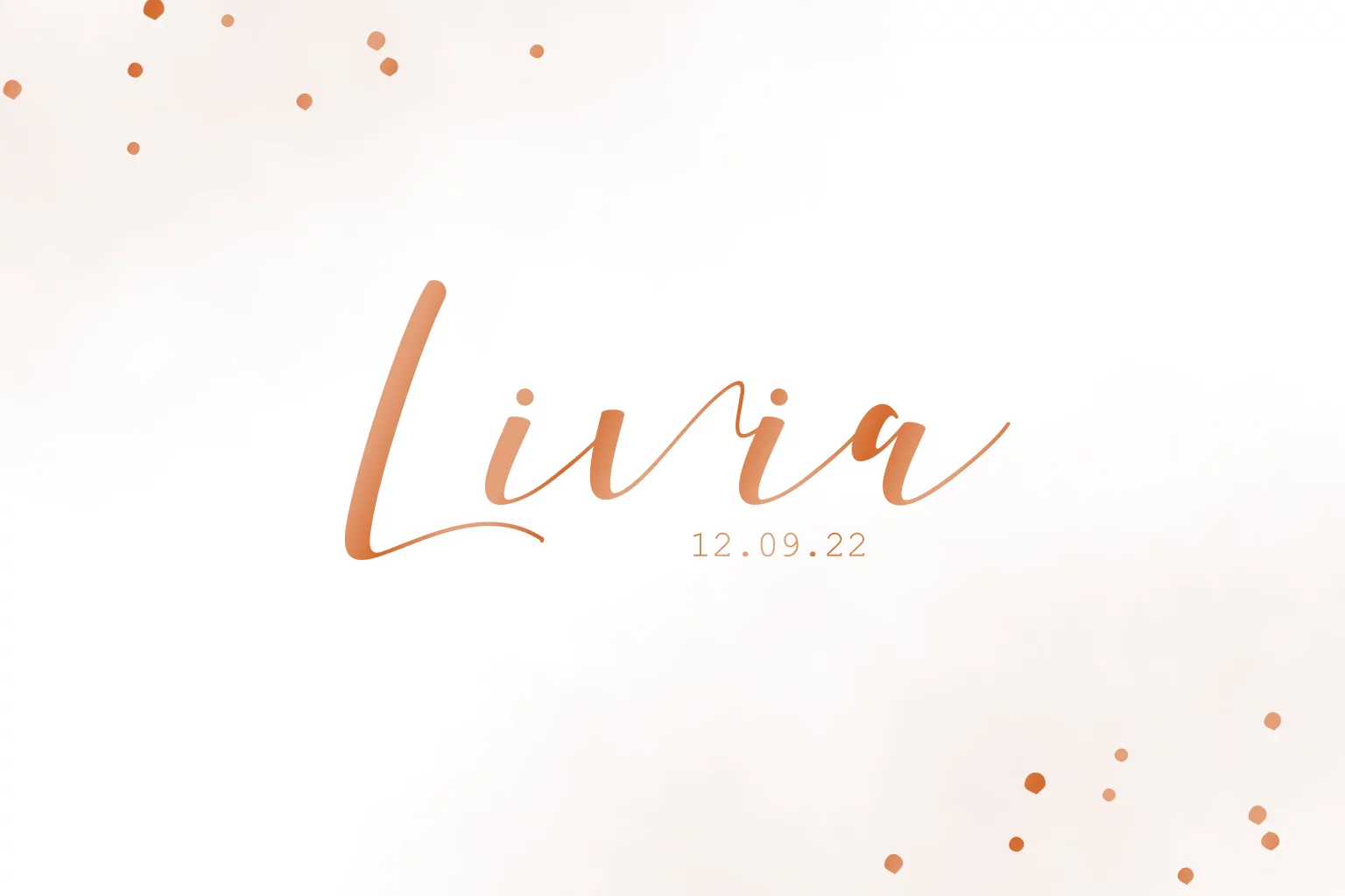 Dit lieve geboortekaartje voor een meisje met naam en stipjes confetti in koperkleurige UV Spotlak zelf een andere kleur geven. Ook kun je de roze kleur aanpassen naar een gewenste kleur.