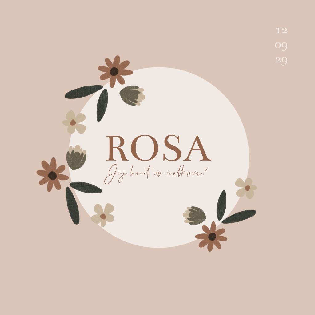 Een lief geboortekaartje voor een meisje met geschilderde bloemen in roze en groene kleuren.