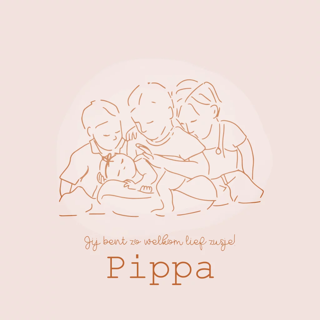Dit lieve geboortekaartje met lijntekening van een lief baby zusje en haar 3 trotse grote broers kun je zelf aanpassen naar wens.
