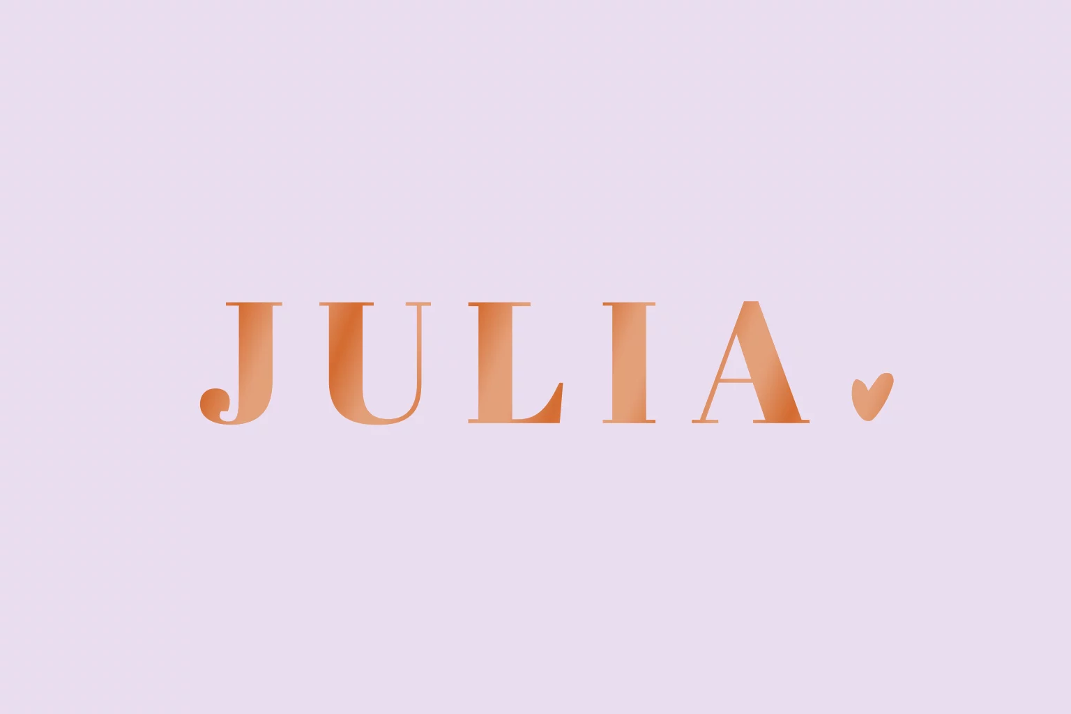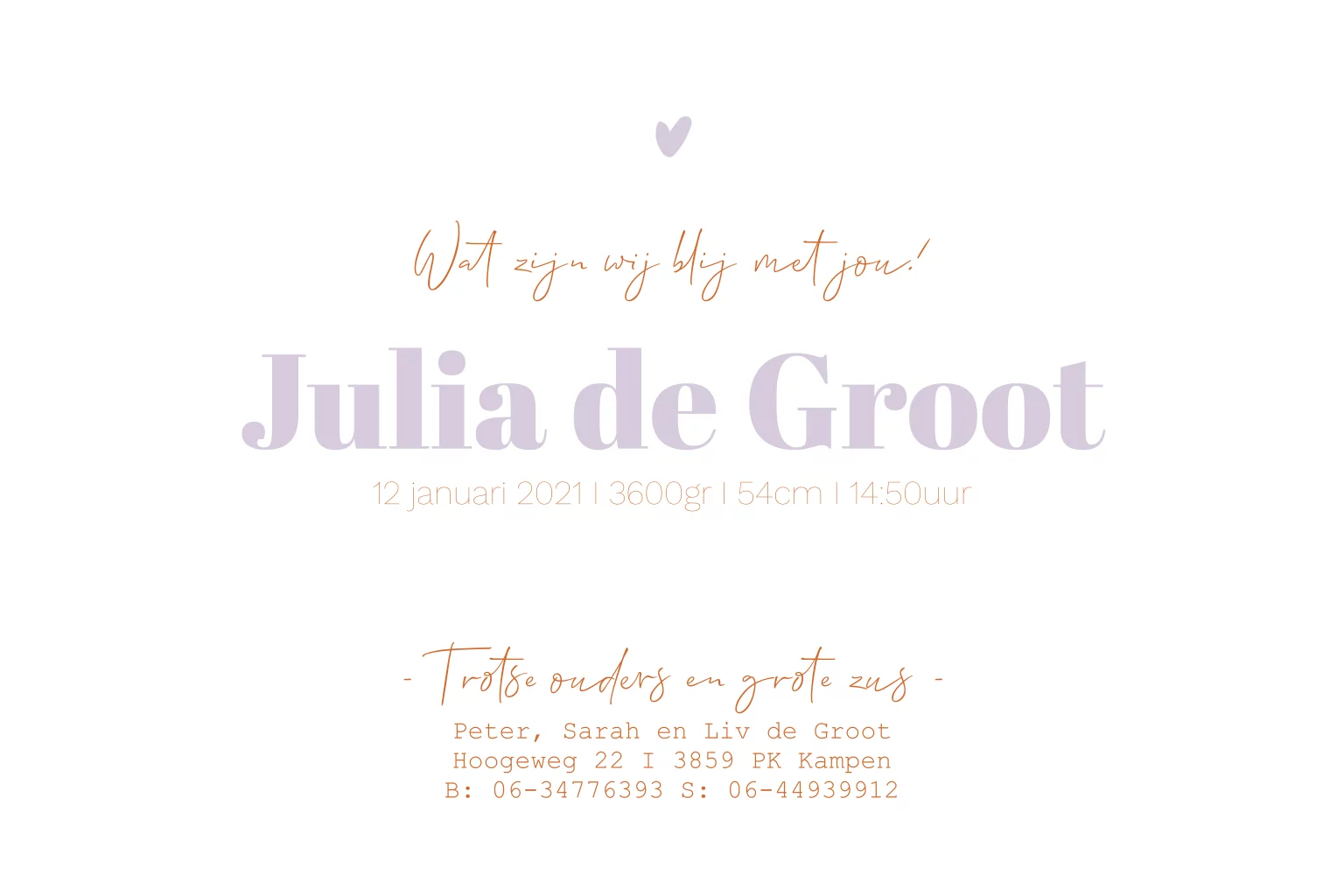 Geboortekaartje meisje lila paars en naam in koperfolie en hartje