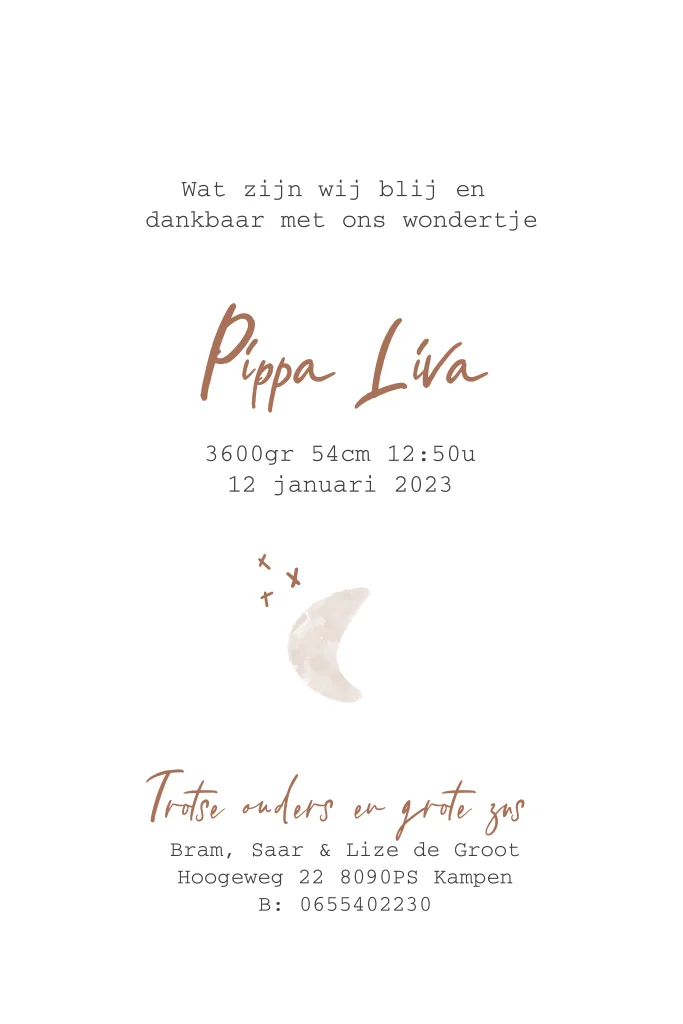 Dit lieve dubbele geboortekaartje met een maan in watercolour, en de lijnen en sterren in goudfolie kun je zelf aanpassen naar wens. De roze kleur is meer voor een meisje maar die kun je natuurlijk helemaal aanpassen naar wens.