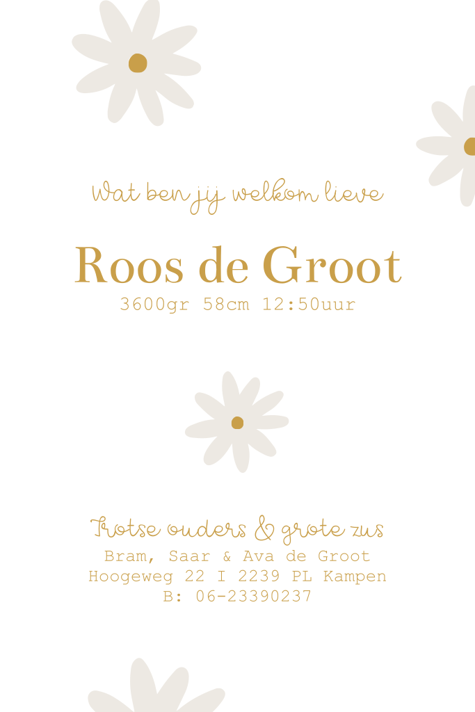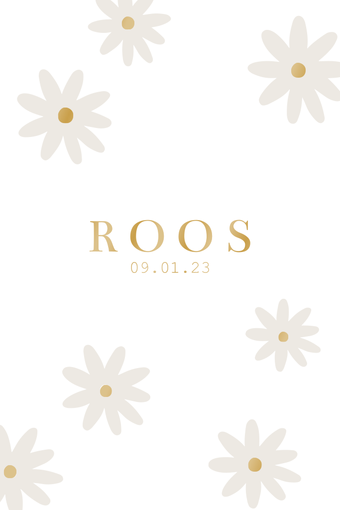 Een lief geboortekaartje voor een meisje met allemaal beige witte madeliefjes gedrukt in UV spotlak.