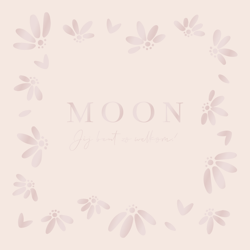 Een lief geboortekaartje voor een meisje met roze bloemen in UV spotlak folie en oranje roze achtergrond. Dit kun je zelf aanpassen naar wens. Moon
