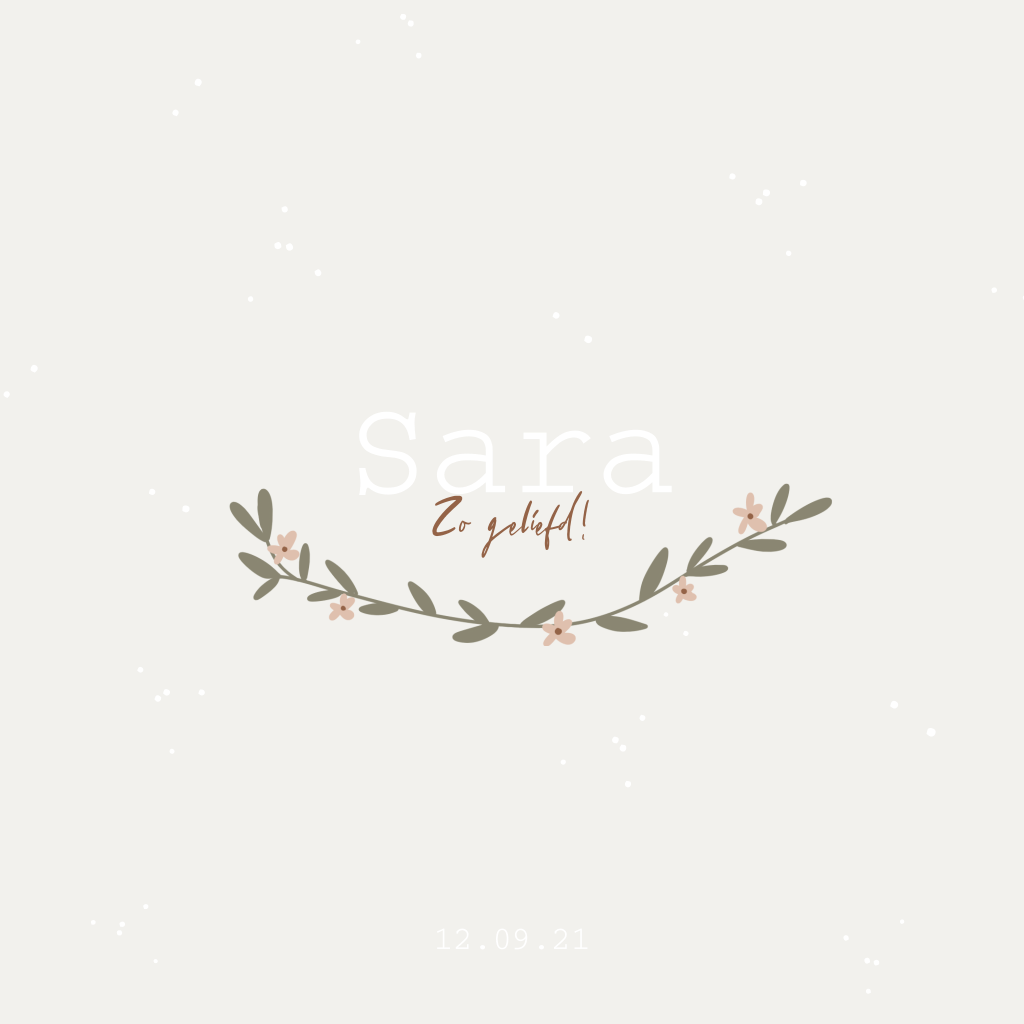 Een lief geboortekaartje voor een meisje met bloemetjes en stipjes en naam in foliedruk. Sara