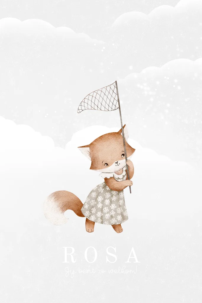Dit lieve geboortekaartje voor een meisje heeft een geschilderd watercolour vosje met visnetje en tekst in zilverfolie. Rosa