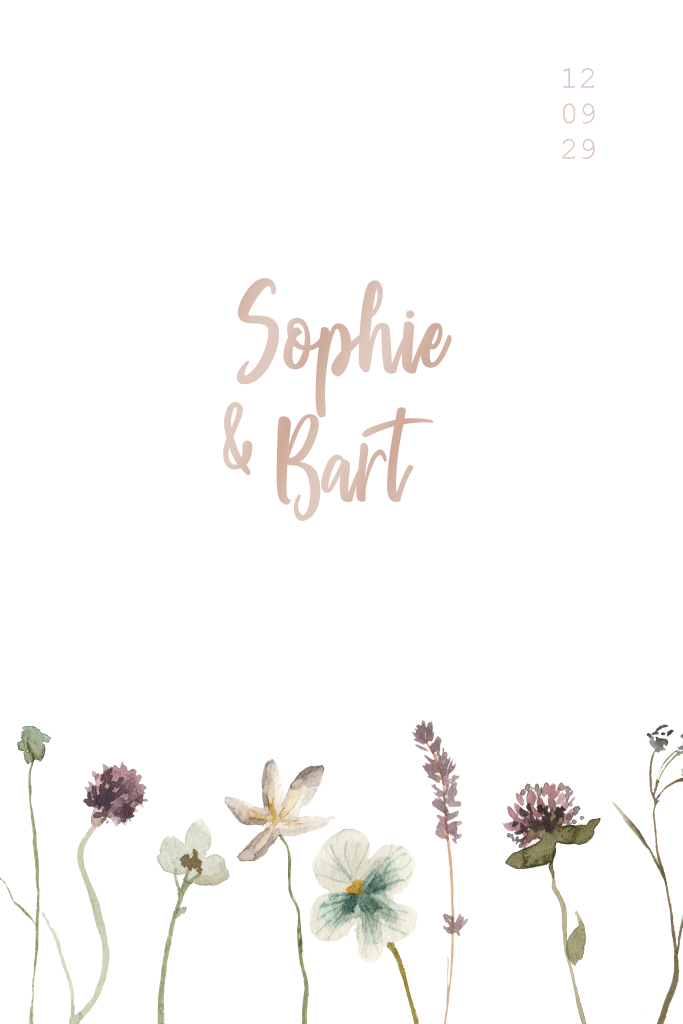 Deze trouwkaart met geschilderde veldbloemen kun je zelf aanpassen naar wens voor jullie bruiloft. Sophie en Bart