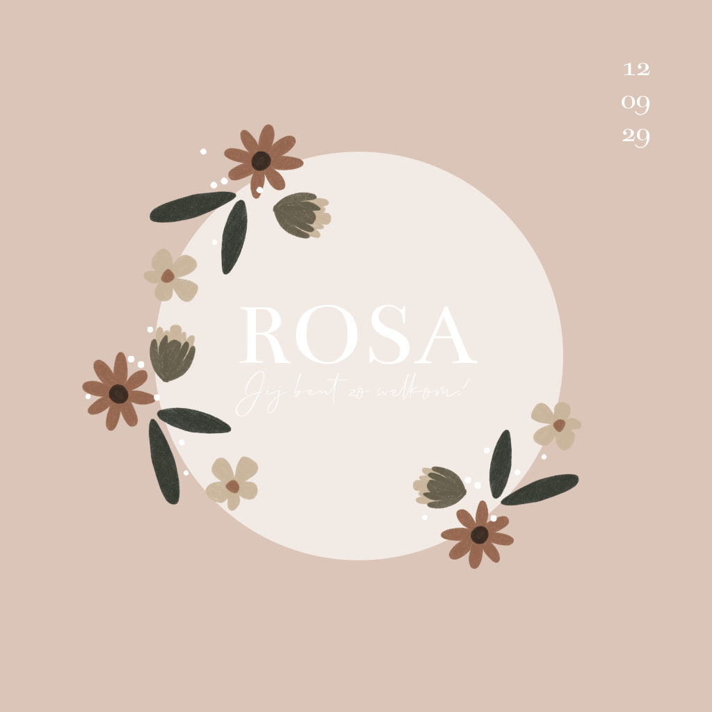 Een lief geboortekaartje voor een meisje met ronde hoeken en daarop een krans met bloemen in roze groene kleuren. Met stipjes in rosefolie en tekst in foliedruk kleur. Dit kun je aanpassen naar wens voor jullie dochtertje.