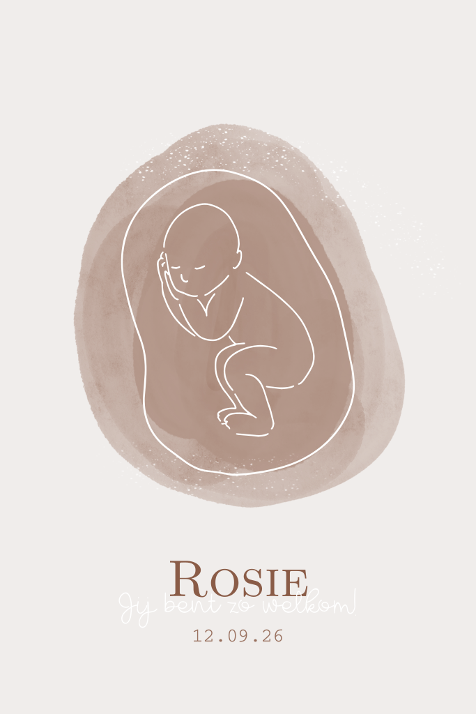 Dit geboortekaartje voor een meisje met de lijntekening van een baby in de baarmoeder kun je zelf aanpassen naar wens. Ook het goudfolie kun je aanpassen en de rood roestbruine kleur ook.