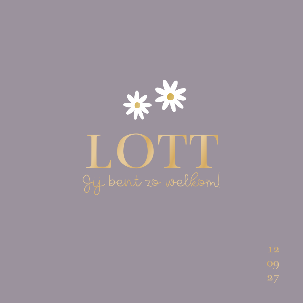 Geboortekaartje meisje met madeliefjes gedrukt in lakfolie lila paars