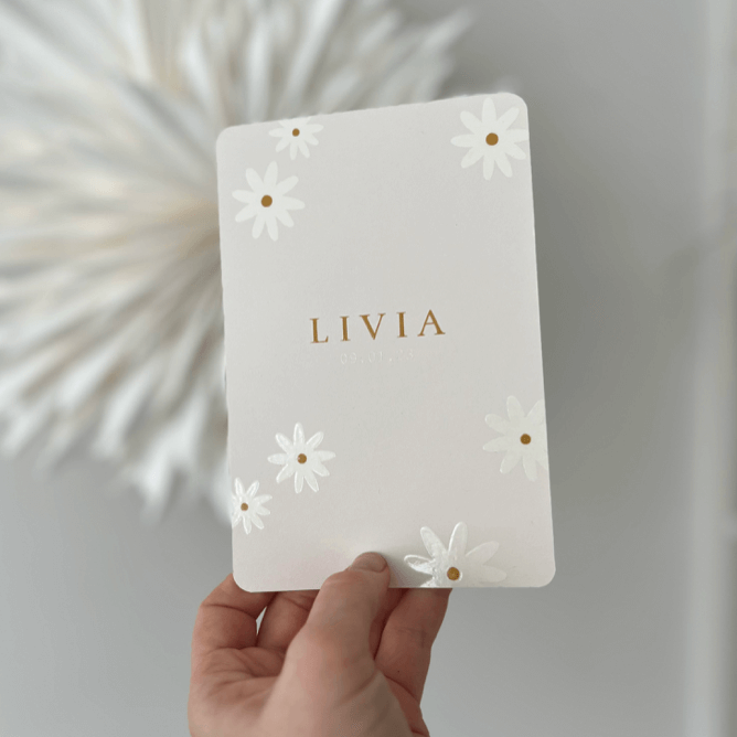 Een lief geboortekaartje met madeliefjes print die er op liggen in spot UV lak in witte kleuren met oker kleurige binnenkant.