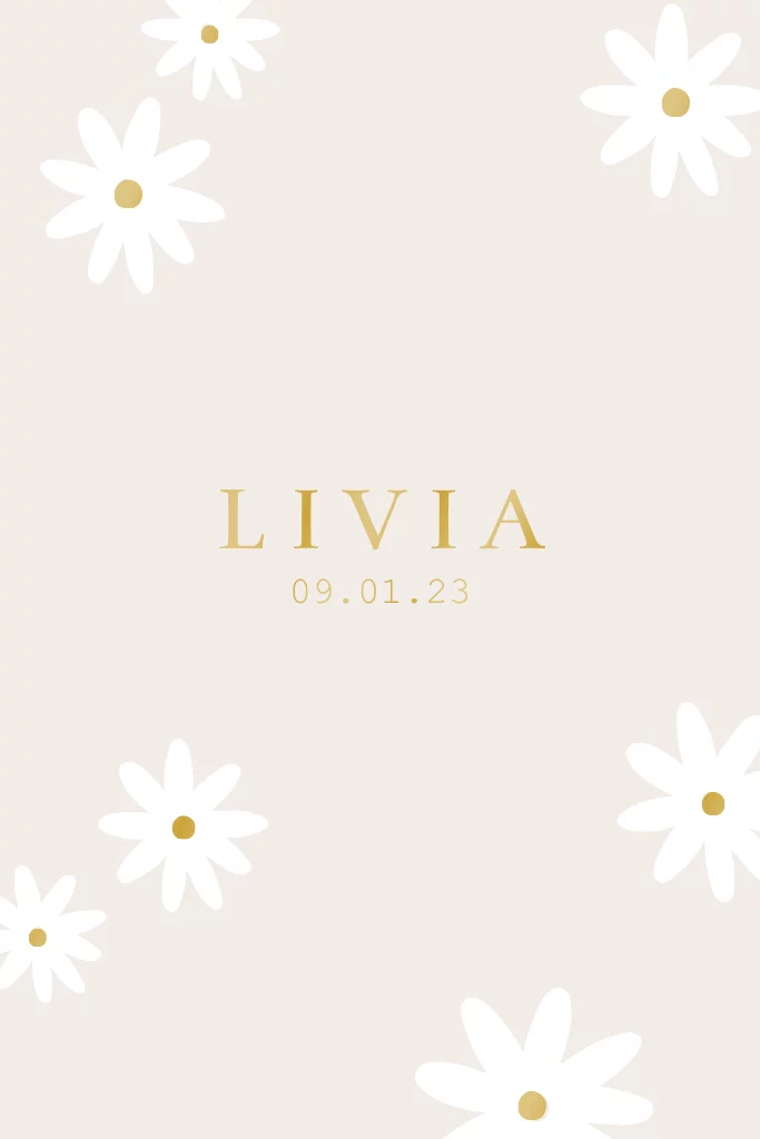 Lief geboortekaartje voor een meisje met witte madeliefjes gedrukt in glimmende UV spotlak. Ook de okerkleurige tekst en binnenkant van de bloemetjes worden met spotlak gedrukt, zo krijg je een prachtig geheel.