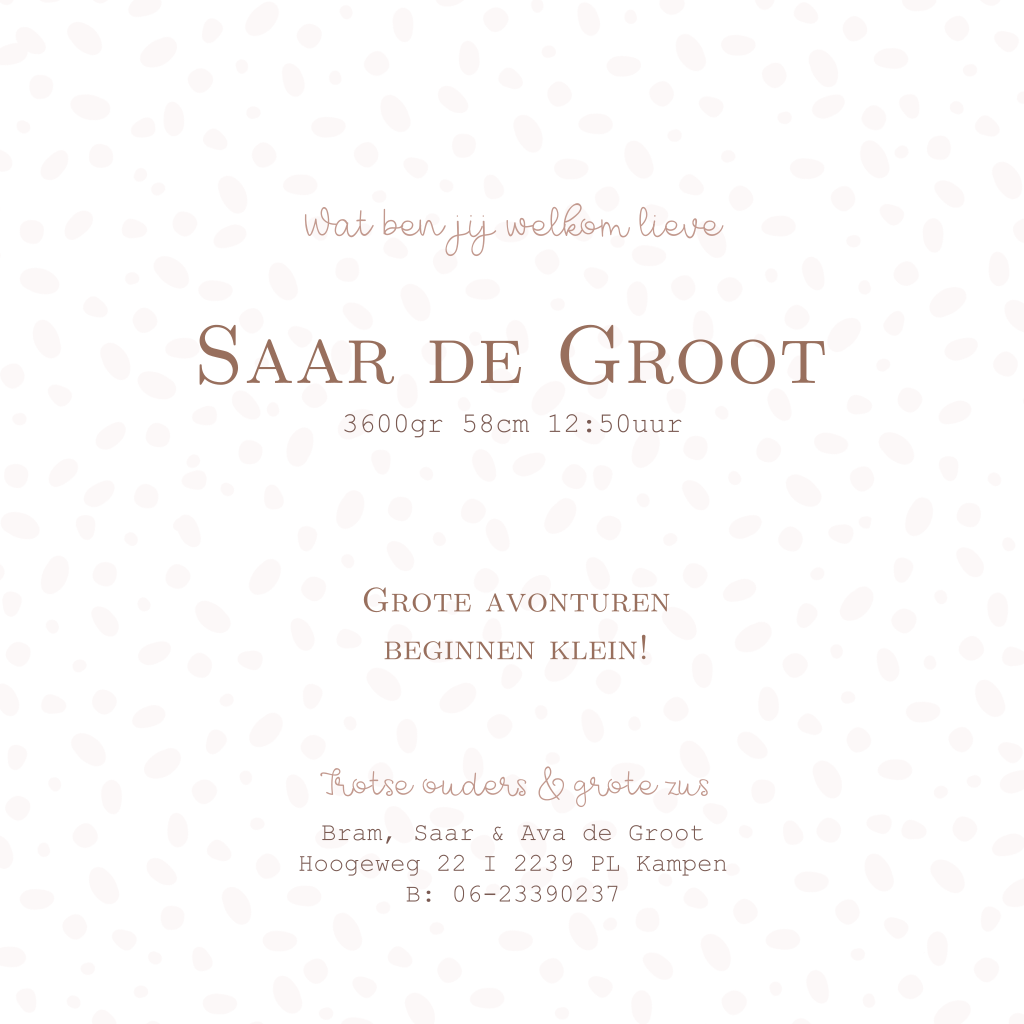 Een lief geboortekaartje voor een meisje dat neigt naar een klassiek kaartje. Minimalistisch met zacht oud roze stipjes in met foliedruk. Je kunt de folie kleur en de roze kleur aanpassen naar wens.