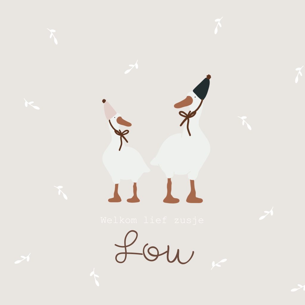 Geboortekaartje meisje met twee gansjes broertje en zusje foliedruk