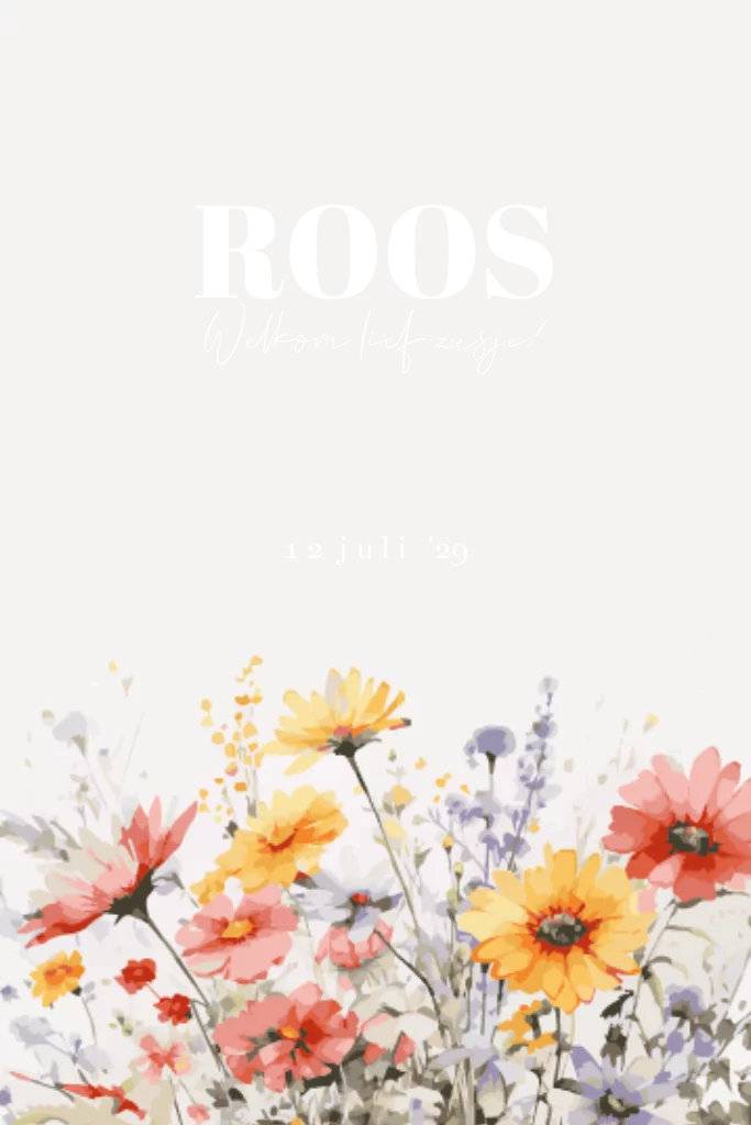 Een vrolijk geboortekaartje voor een meisje met allemaal vrolijke geschilderde veldbloemen. De tekst in roséfolie kun je ook aanpassen naar wens. Roos