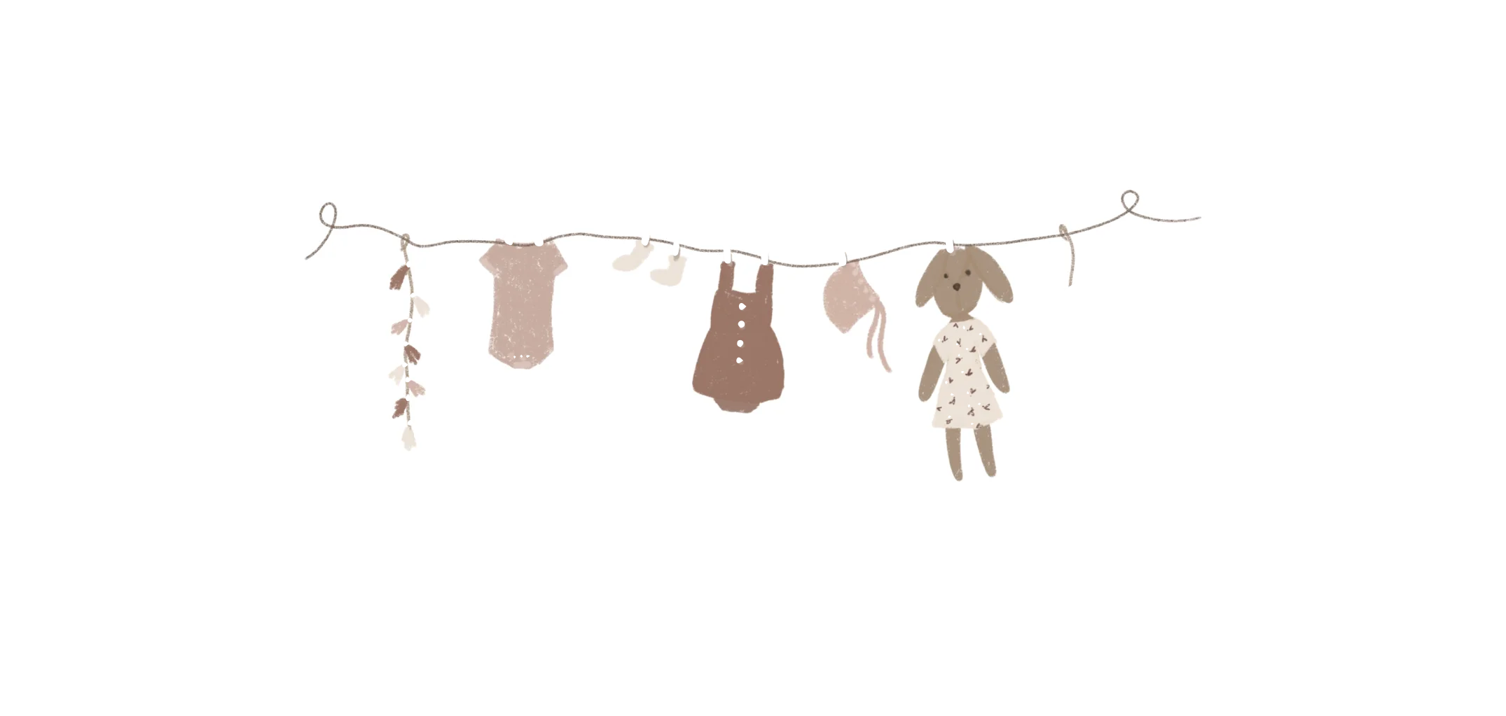 Aan het waslijntje: slinger, romper, sokjes, jurkje, bonnet mutsje, knuffeltje, maan slingertje.