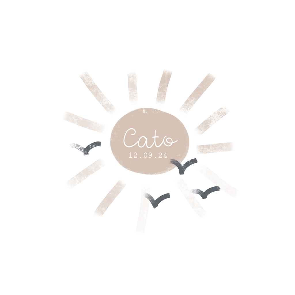 Dit lieve geboortekaartje met zon met verfstrepen en vogeltjes in roze en blauw tinten kun je zelf aanpassen naar wens. De naam in goudfolie en de fonts kun je ook aanpassen.