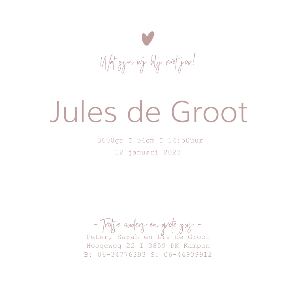 Minimalistisch geboortekaartje voor een meisje met goudfolie en roze achtergrond. Alles in dit kaartje kun je helemaal aanpassen naar wens. Ook de folie kleur kun je omzetten in bijvoorbeeld zilverfolie of koperfolie.