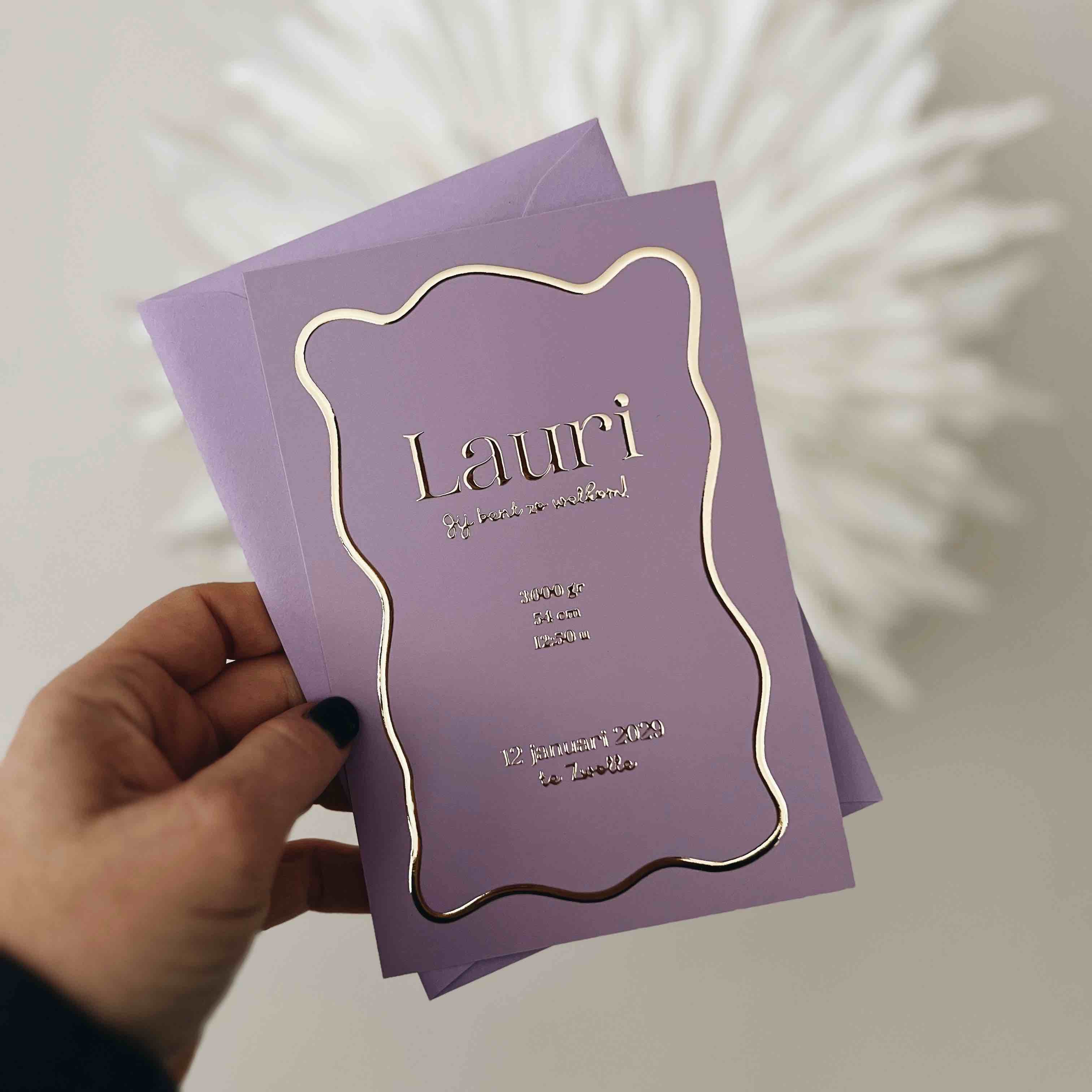 Geboortekaartje meisje paars lila met organische lijn in goudfolie