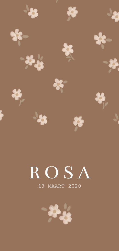 Een langwerpig geboortekaartje voor een meisje met bruin rode achtergrond. De lieve watercolor bloemetjes komen mooi uit op deze achtergrond.