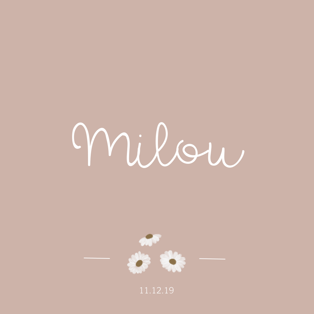 Een minimalistisch geboortekaartje voor een meisje met daisy madeliefjes en naam in goudfolie. De roze achtergrond kun je aanpassen naar wens. Ook kun je de madeliefjes weghalen of juist vermenigvuldigen.