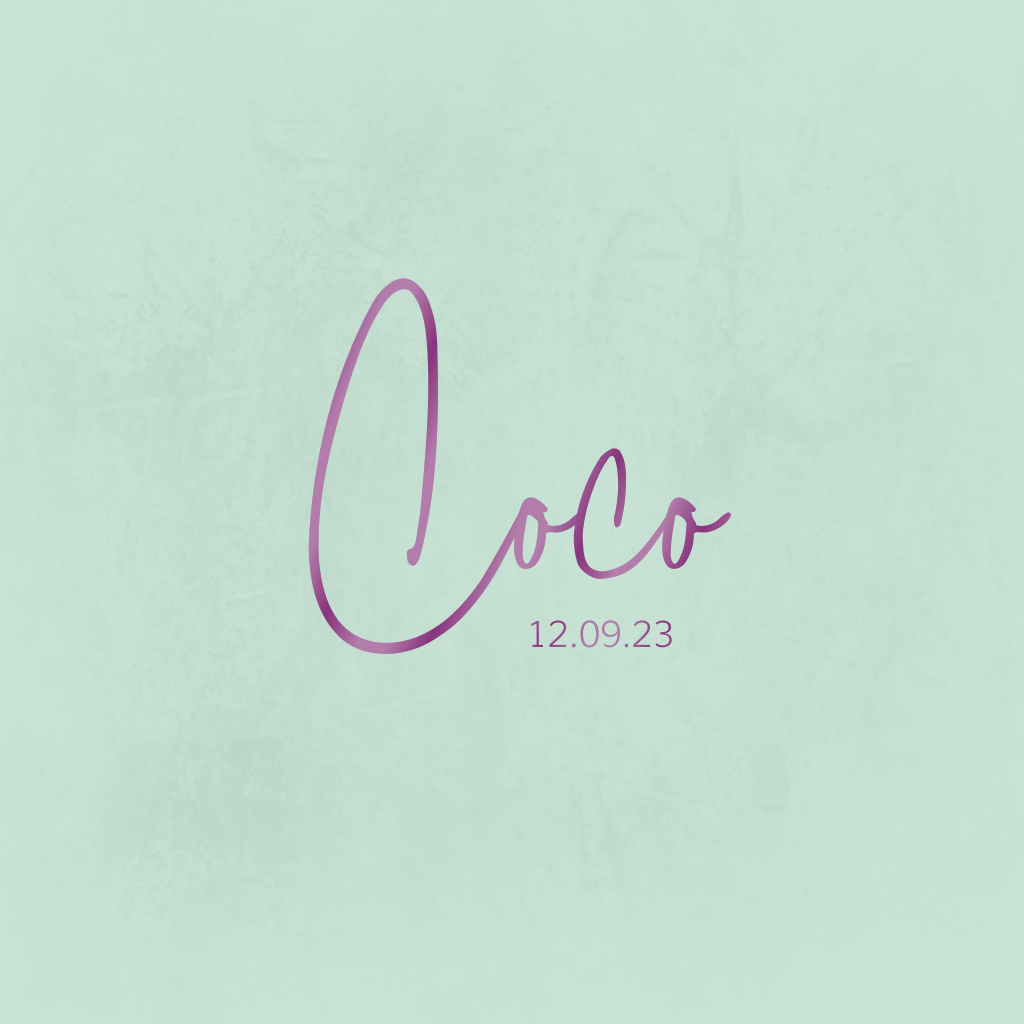 Dit minimalistische geboortekaartje voor een meisje met mintgroene achtergrond kleur en de naam in paarse UV spotlok kun je zelf aanpassen naar wens.