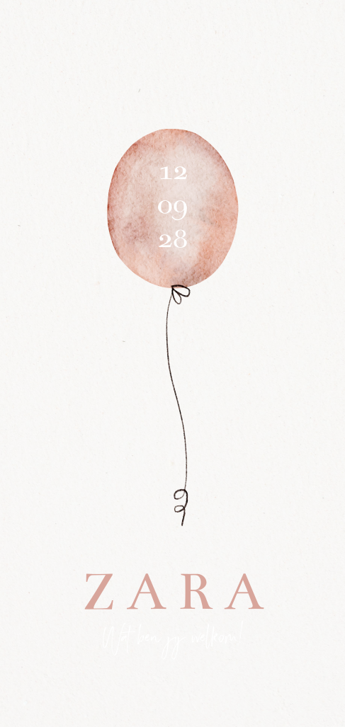 Een lief minimalistisch geboortekaartje met een geschilderde ballon in roze tinten. De datum met rosé folie in de ballon.