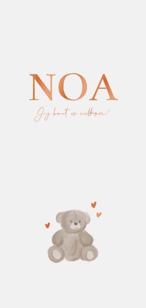 Lief geboortekaartje voor een jongen of meisje met lief geschilderd watercolour beertje voor een jongen of meisje. Noa