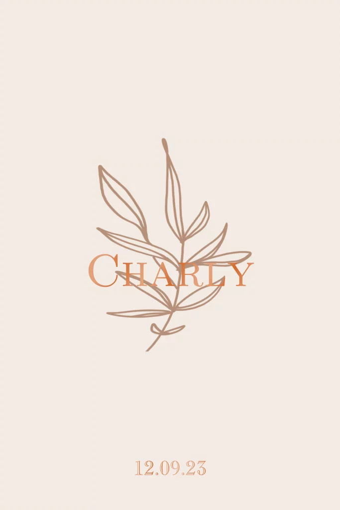 Een minimalistisch geboortekaartje welke zowel voor een jongen als een meisje kan. Een mooi takje met de naam in koper kleurige UV spotlak. De kleuren kun je zelf aanpassen naar wens en smaak. Ook de folie kleur.