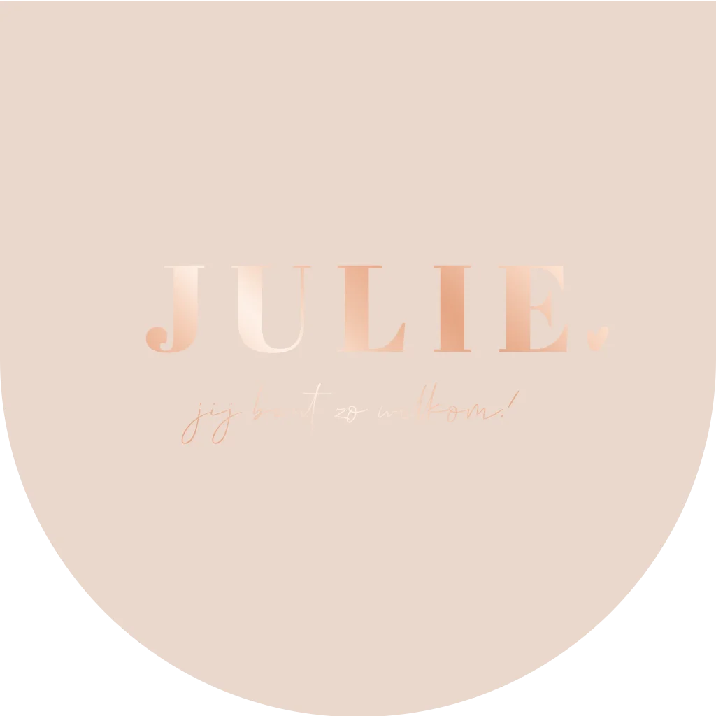 Geboortekaartje voor een meisje met halve ronde voorkant op vierkante achtergrond met naam in roséfolie met een hartje.