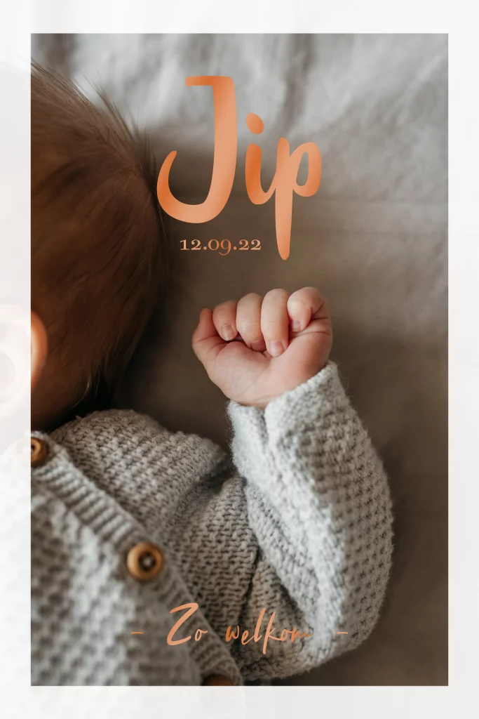Dit geboortekaartje kan zowel voor een jongen als een meisje het kaartje is ontworpen met koper kleur in UV spotlak maar je kunt het folie ook aanpassen naar een andere kleur. Ook de kleuren van de achterkant past je aan naar wens.