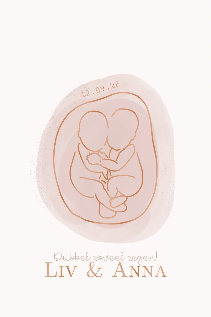 Dit geboortekaartje voor een tweeling heeft nu een beetje rozige tinten waardoor het misschien meer geschikt is voor twee meiden. Maar door de kleuren aan te passen maak je er een mooi unisex geboortekaartje van voor jullie twins.