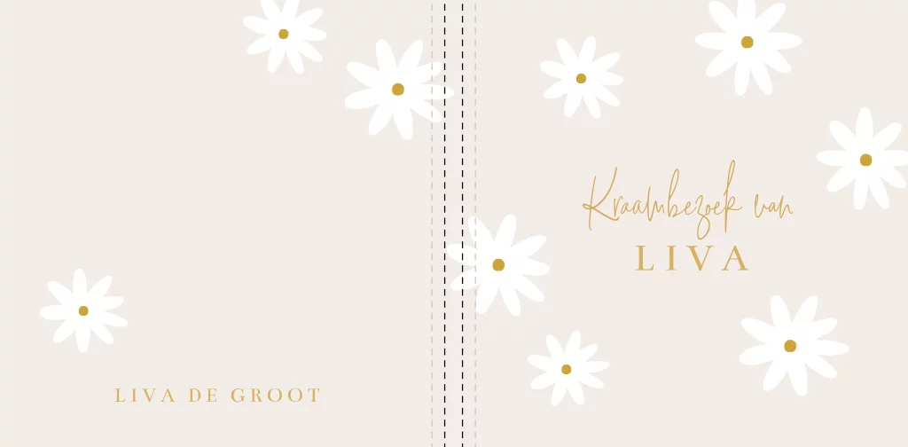 Dit kraambezoekboek voor een meisje met lieve madeliefjes kun je zelf helemaal aanpassen naar wens. De kleuren en het lettertype kun je aanpassen.