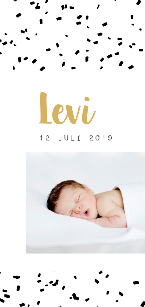 Staand langwerpig geboortekaartje met okergele letters en stoere verfspetters.