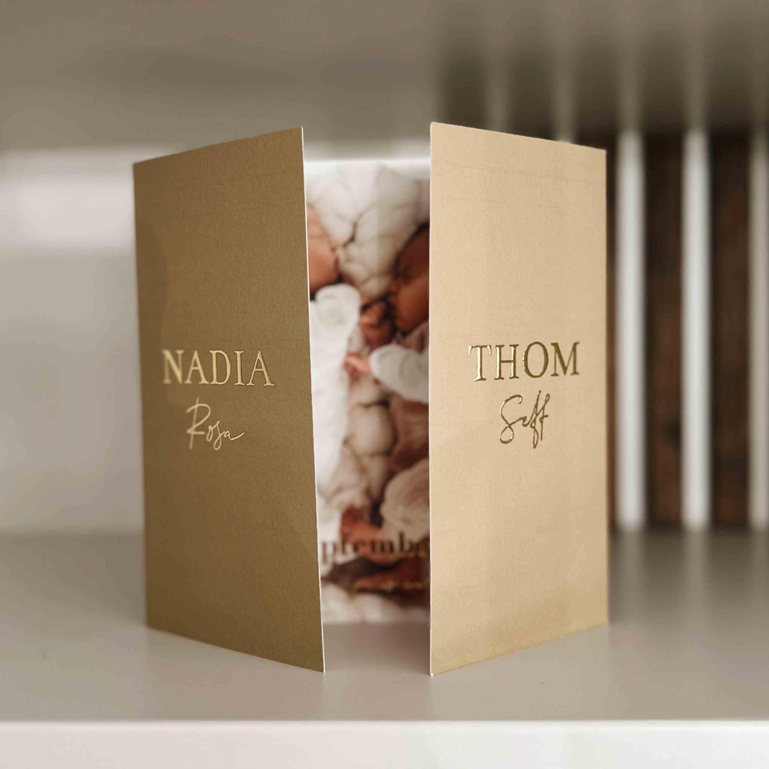 geboortekaartje tweeling theater luikvouw met goudfolie en olijfgroen