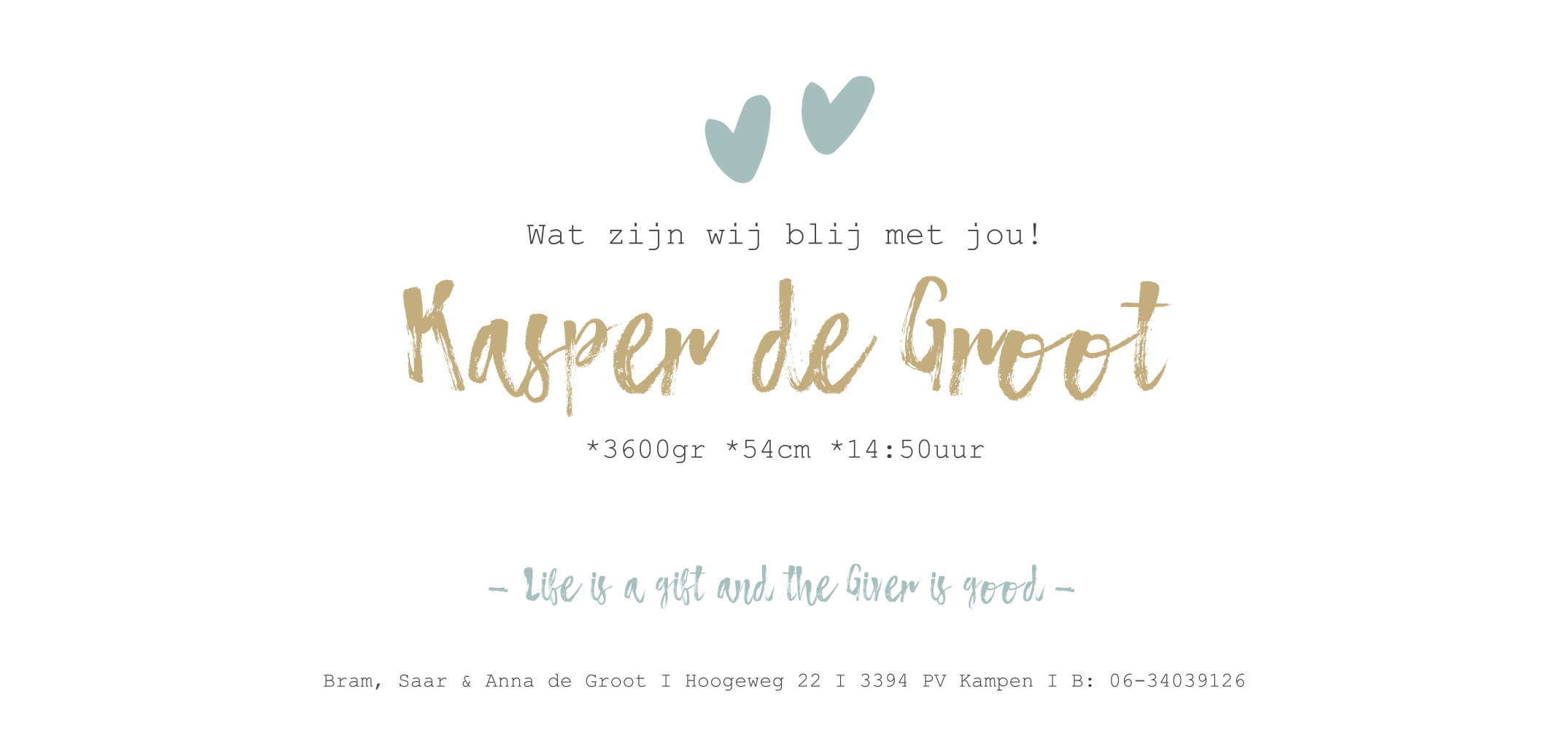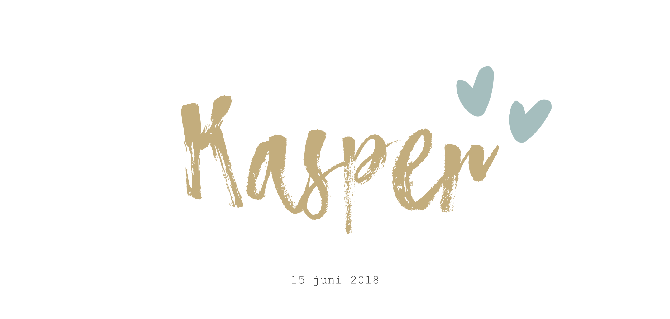 Dit dubbele panorama geboortekaartje voor een jongen met goudkleurige letters en blauwe hartjes kun je helemaal aanpassen naar wens. Kasper