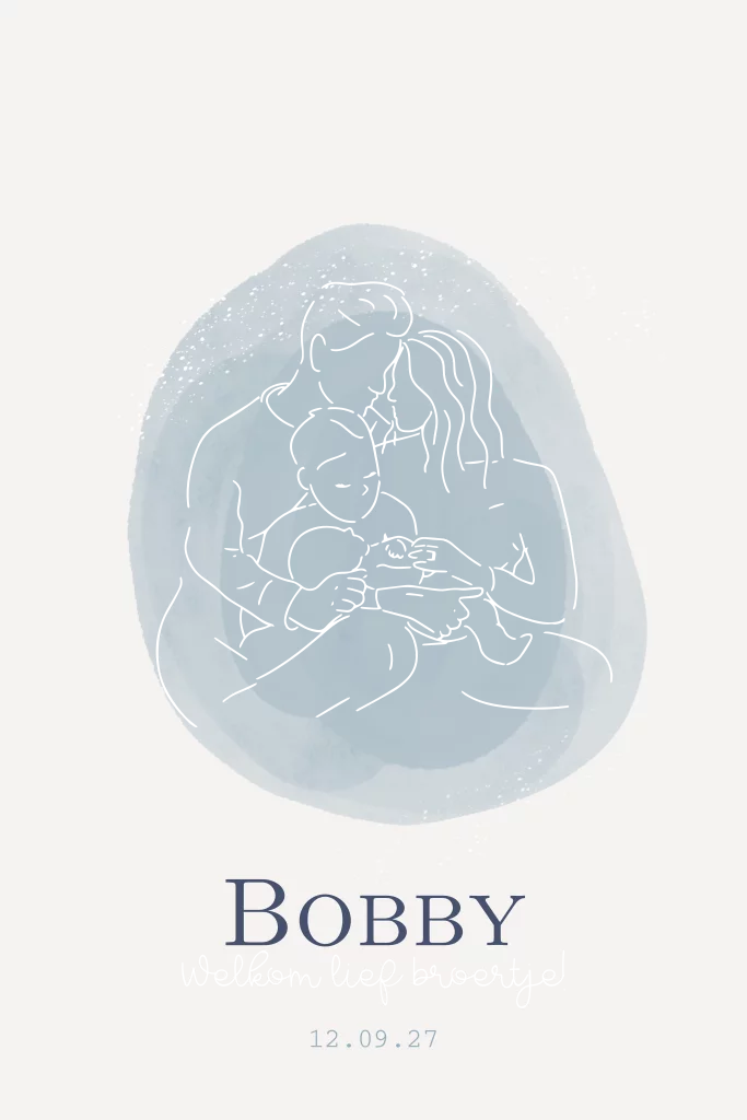 Geboortekaartje broertje lijntekening van gezin in goudfolie en blauw